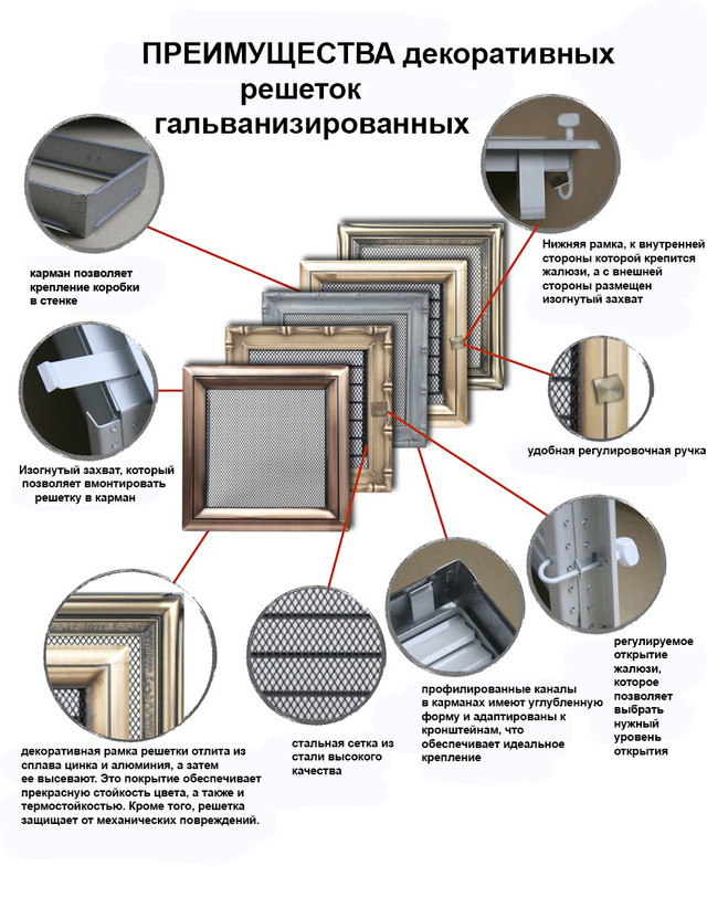 Вентиляционная решетка для камина устанавливается в завершение воздухоотводного канала, который распределяет нагретый камином воздух гравитационным или механическим способом. А также служит для природной вентиляции каминного короба. Ее монтируют в стенку или непосредственно в короб камина. Комплект решетки состоит из фасада - рамка с сеткой и специальной монтажной коробки, которая изготовлена из листа оцинкованной стали.